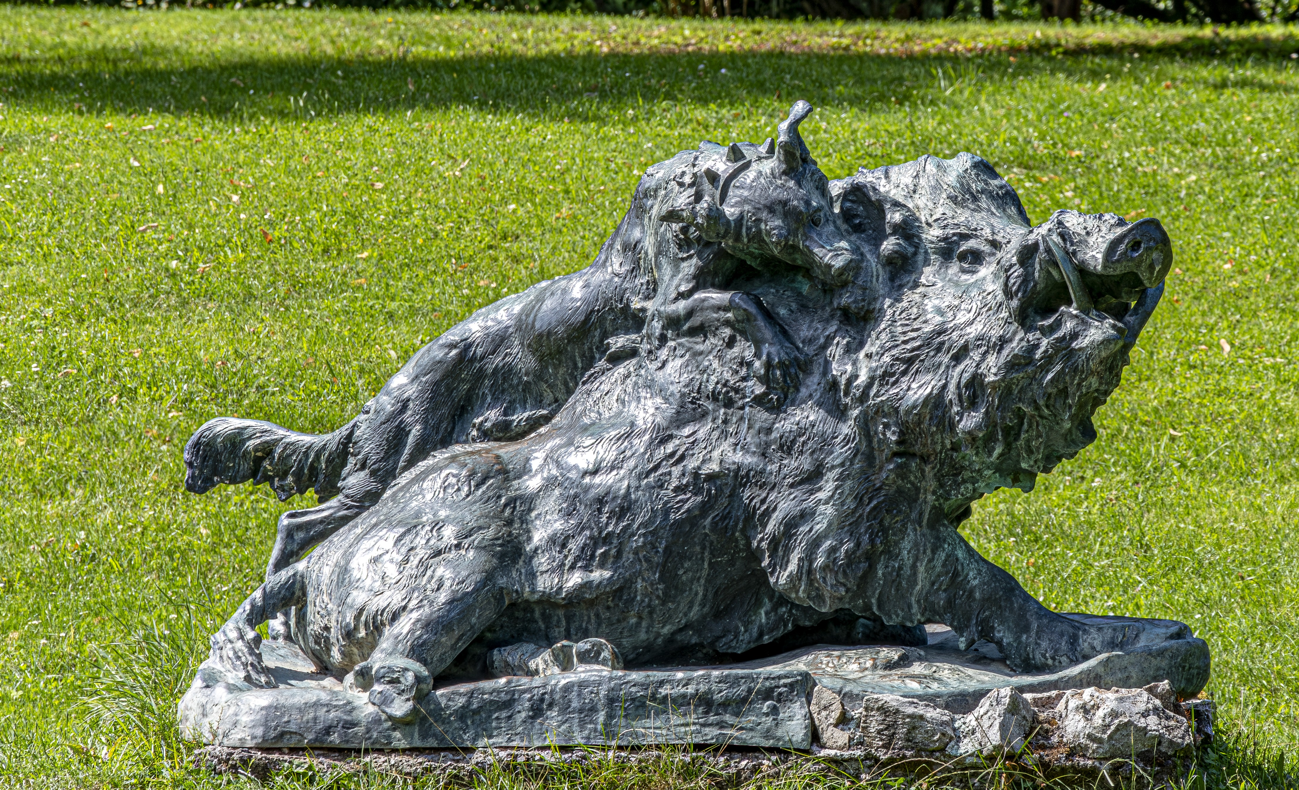 - Ďalšia socha, ktorú tu môžete vidieť je diviak so psom. Táto socha pochádza z roku 1902. Socha vystavená v Topoľčiankach je kópia, originál tejto sochy je vstavený v Liptovskom Hrádku pri lesníckej škole. Táto socha je taktiež prístupná aj pre vozičkárov.