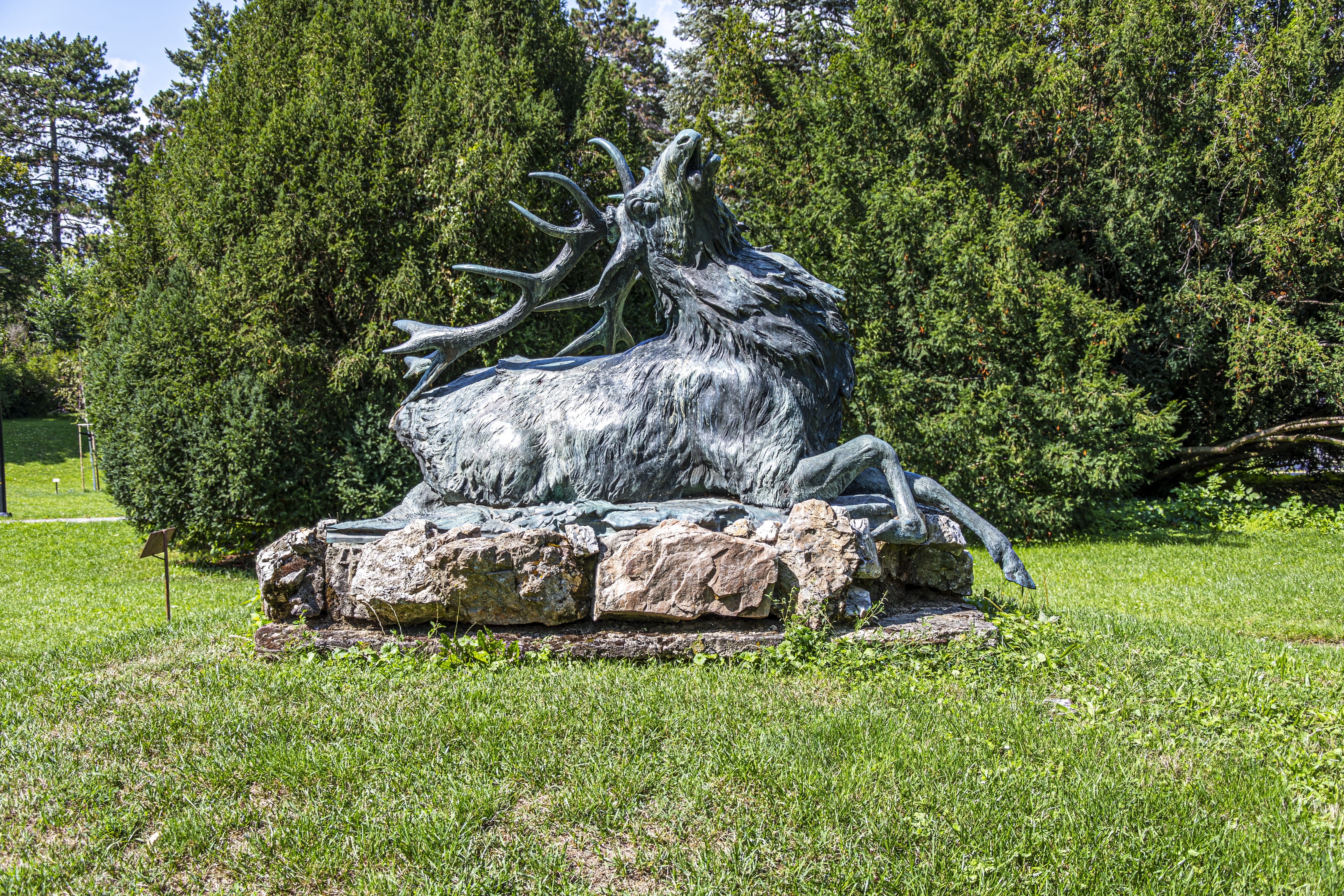 - Ďalší originál, ktorý tu môžete vidieť je zhasínajúci jeleň, ktorý pochádza z roku 1900. Tento originál si môžete pozrieť. Táto socha bola dlhé roky umiestnená v parku v Stupave. Potom sa podarilo doviezť ho do zámockého parku v Topoľčiankach. Je vystavený v blízkosti zámočka a je taktiež prístupný aj pre vozičkárov.