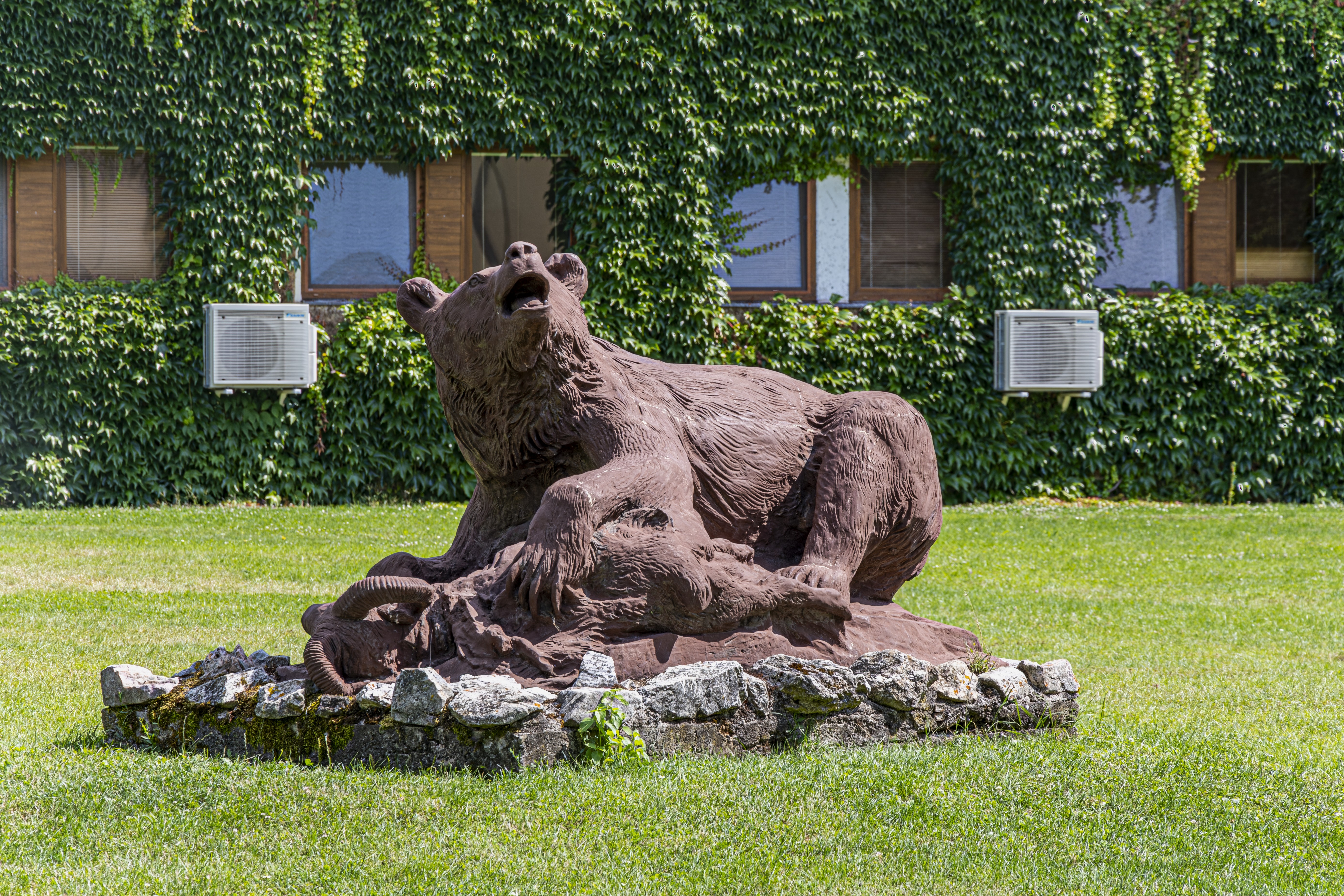 - Jeden je medveď s muflónom a pochádza z roku 1909, kópia tejto sochy je vystavená priamo pred poľovníckym zámkom, nakoľko originál bol v minulosti poškodený. Tak aby sa po oprave originálu vyhlo ďalšiemu poškodeniu vzácnej sochy. Originál je vystavený v zámku. Kópia sochy pred zámkom je prístupná aj s invalidným vozíkom.