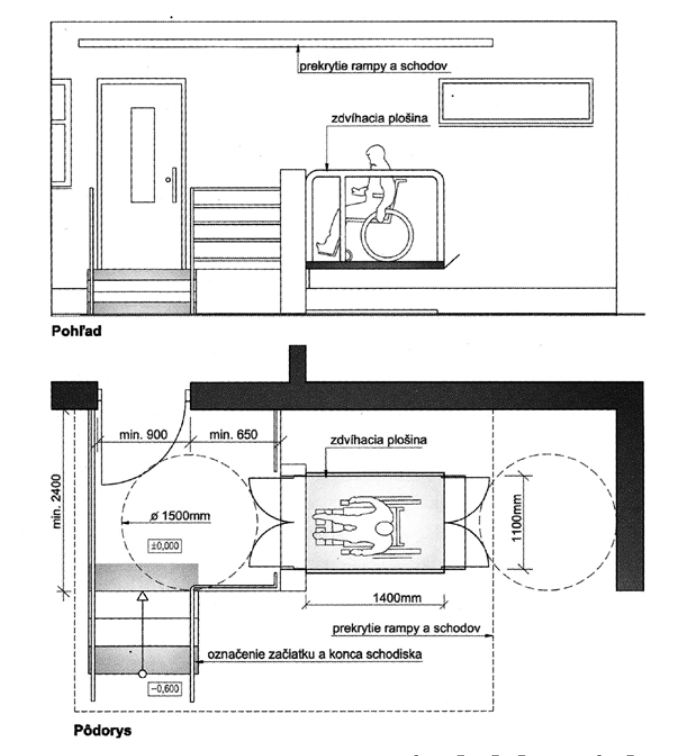 Exteriérové schodisko so zdvíhacou plošinou pod markízou.